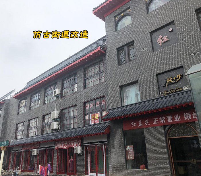 我們可以在大大小小的仿古商業街的屋面看到很多仿古瓦的瓦型;對于仿古商業街來講,仿古瓦的形狀就是一種簡單的坡面,然后樣式是仿古瓦的,帶一點點屋脊和吻獸;這種瓦的形狀是完全可以使用連體仿古瓦來做的,不僅僅是生產效率高,和施工方便兩個好處了,更多的是連體仿古瓦的價格還適中,比分體的更便宜;適合于普通預算的施工屋面,更大眾化,通俗的講,價格上更親民。