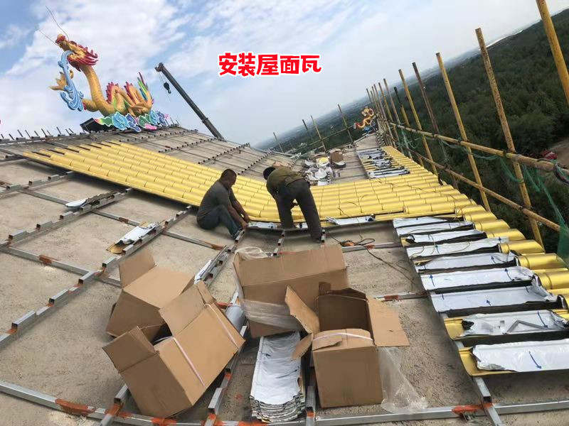 對于裝瓦這塊的工藝就非常的簡單,注意好順序即可;因?yàn)辇埞且呀?jīng)焊接好,安裝瓦就更簡單;瓦安裝需要從屋檐到頂?shù)捻樞騺戆惭b;遇到碰角的位置有當(dāng)溝來替補(bǔ)。屋面瓦的安裝主要工藝是板瓦直接用鉚釘打在次龍骨上,筒瓦用鉚釘打在兩邊的板瓦上,筒瓦與筒瓦是一個一個通過卡扣來連接的,板瓦是一個板瓦搭接一個板瓦;筒瓦是卡扣連接。